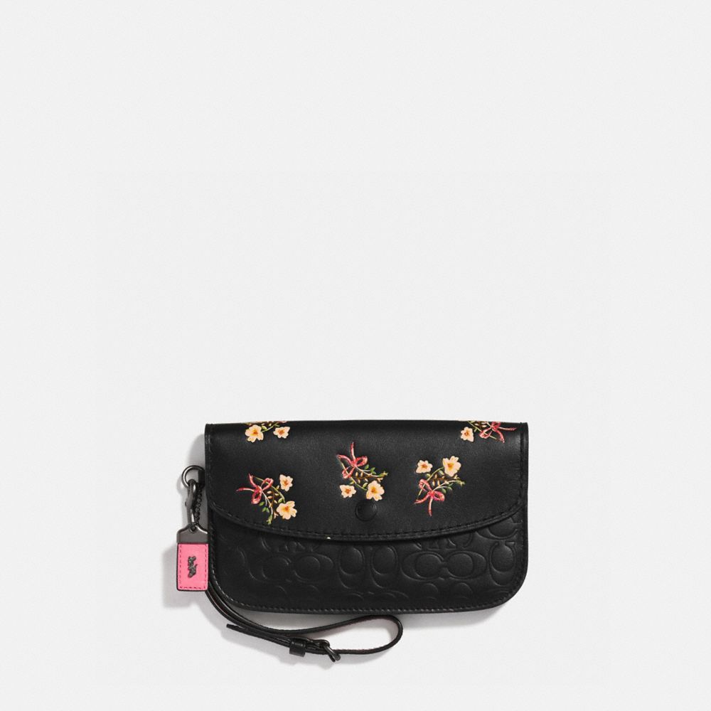 Dieser Style aus unserem charakteristischen Leder ist Tasche mit Handschlaufe und Clutch in einem. Der Umschlag ist mit unserem Blumen- und Schleifenmotiv bedruckt. In den Innenfächern mit und ohne Reißverschluss können Smartphone, Geldscheine, Münzen und Karten sicher aufbewahrt werden.