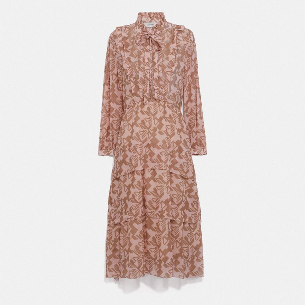 Ändern Sie im Nu Ihren Look mit unserem gestuften Kleid aus leichter Seide, indem Sie das lange Bindeband offen, als lockeren Knoten oder als voluminöse Schleife tragen. Es zeigt eine verspielte Version unseres legendären Pferdekutschenmotivs in einem kühnen, geometrischen, vom Art déco inspirierten Print und ist mit einem Rüschenkragen, gewellten Blouson-Ärmeln und einer taillierten Form versehen.