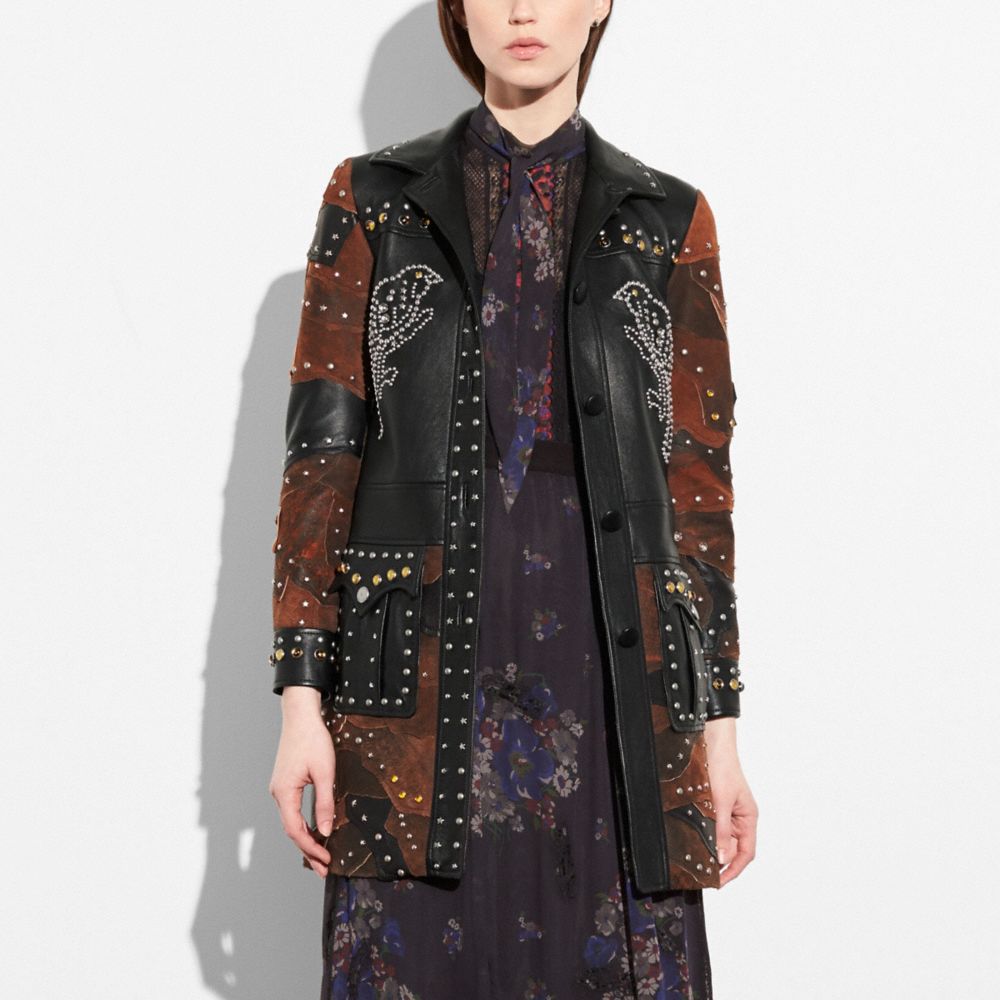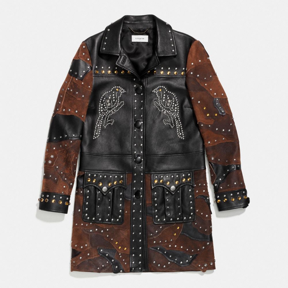 Ein bisschen Country, ein bisschen Rock-'n'-Roll. Dieser Lammledermantel besticht durch seine tollen Details, die sowohl an urbane als auch Westernlandschaften erinnern. Mehrlagige Wildlederaufnäher sorgen für jede Menge Struktur, während die Nieten an den Rändern einen einzigartig definierten Look erzeugen. Mit Vogelmotiven, bernsteinfarbenen Cabochons und Metallrosen für ein individuelles Flair.