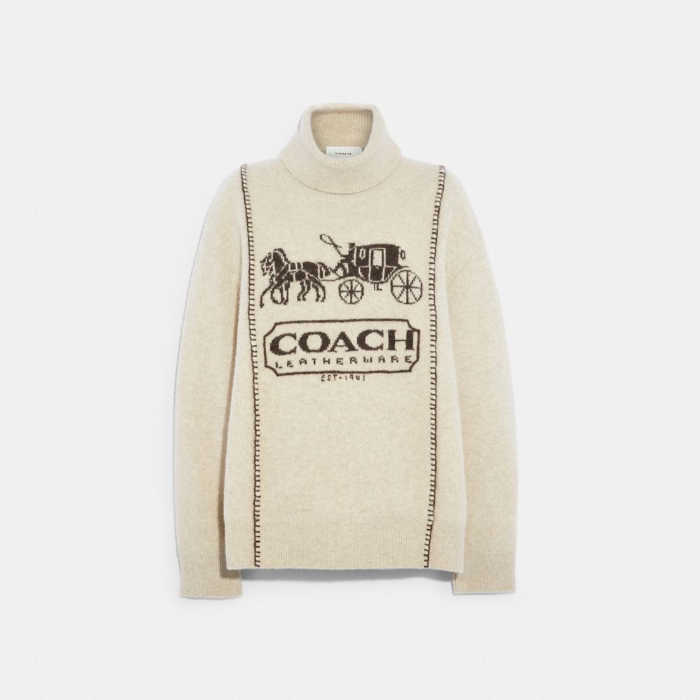 Dieser Rollkragenpullover aus Wolle und Kaschmir ist unwiderstehlich weich. Im Dekor aus unserem Pferdekutschenmotiv und dem Coach-Emblem kommen Ikonen zusammen. Das lässig geschnittene Design ist mit kuscheligen Rippbündchen und auffälligen Languettenstichdetails versehen.