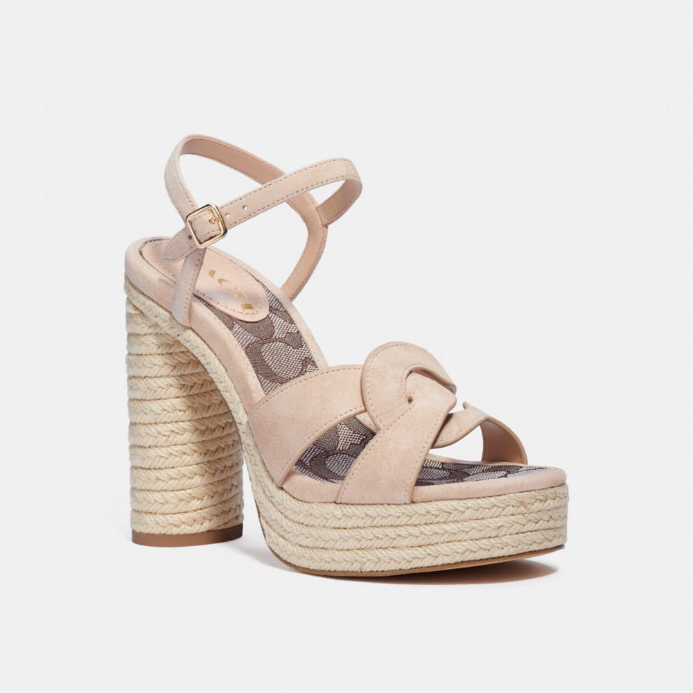 Die Talina Sandale mit Plateausohle verfügt auf den überkreuzten Riemen über einen neuen Twist unseres legendären Markenzeichens. Das Modell mit Knöchelriemen wird aus samtigem Wildleder mit einem Webbesatz aus Jute und unserem charakteristischen Jacquard-Fußbett gefertigt.